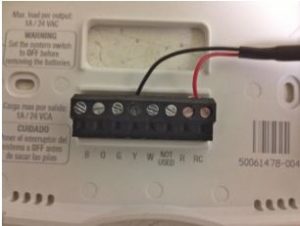 After identifying the correct terminals with a meter and connecting a pair of wires to them, I mounted the alarm thermostat base under the room thermostat and snapped it into place.