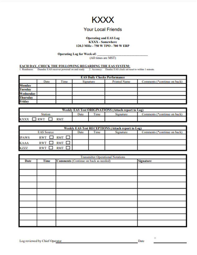By the way, there is nothing to say you cannot do an entire month on one sheet of paper. Some stations save the month’s EAS or other items in computer file, with a cover that shows weekly compliance.