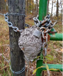 Mike Murrell, who shared this picture he got from someone else, noted that it was a matter of only a few weeks between when the gate was easily access and this condition, when someone was confronted with a sizeable hornet nest. In the end, they opted to return another day.