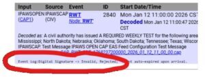 1/12/26 – This week’s IPAWS RWT did not go off correctly and – remember, these are tests – was a true test of your EAS device! From the FEMA:
